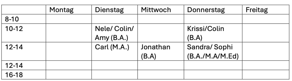 Im Sommersemester finden unsere Sprechstunden zu folgenden Zeiten in unserem Büro in GB 5/150 statt: